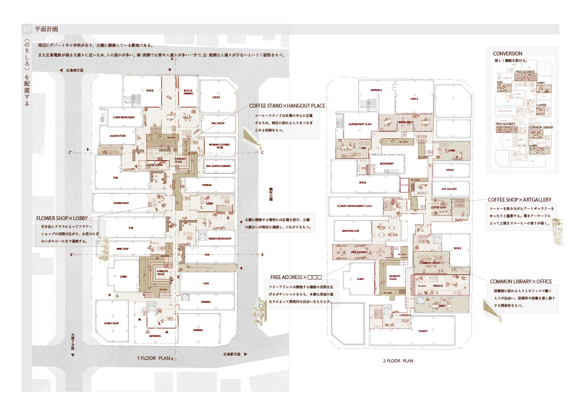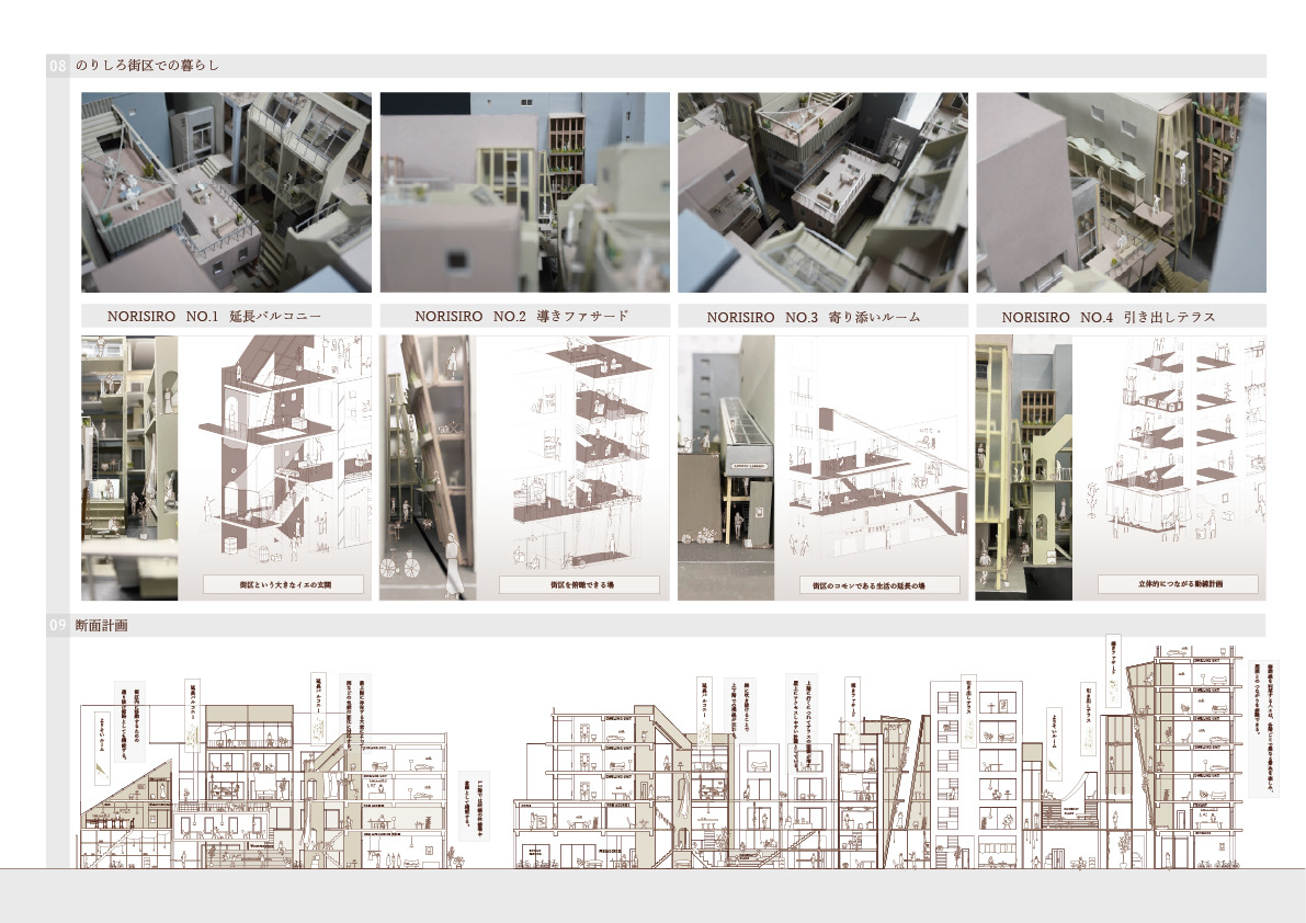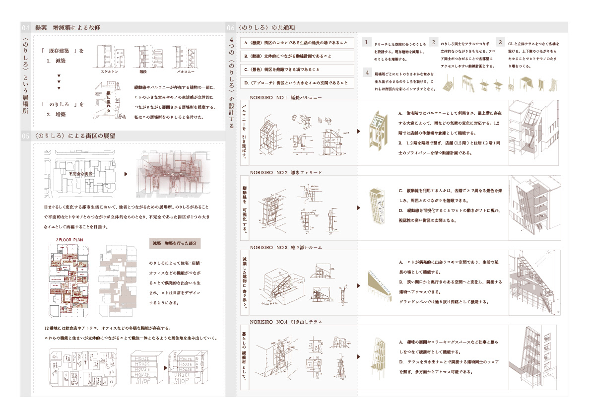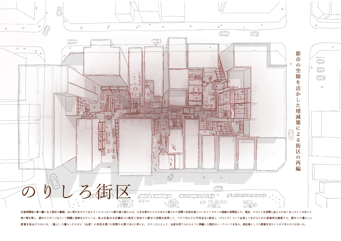 な一つの家族のように都市に暮らすという提案である。再開発による大きな建物の複合化ではなく、既存建物の記憶を残しながら人間的なスケールで職場と住まいとの境界を曖昧にし、多様な出会いや交流を生みだすことが目指されている。これまで街から閉ざされていた内部空間を「のりしろ」により段階的に外部に開放することで、都市で暮らす人々の新たな関係性を構築している点が秀逸である。
