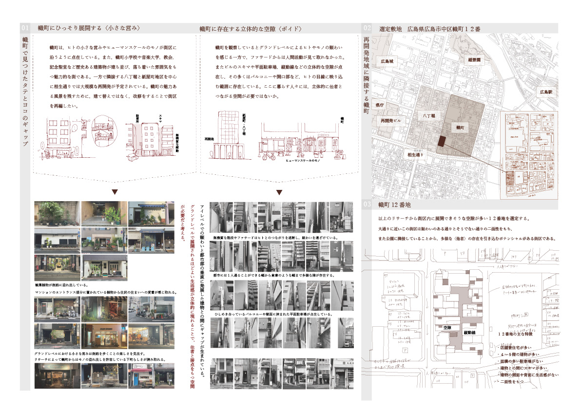 この作品は、広島市中心部にある幟町12番地の一街区において、空き部屋やスキマなどの空隙を活用し